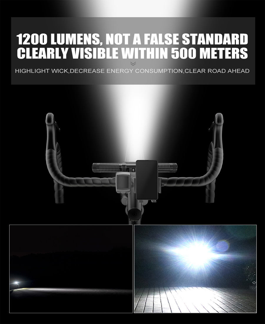 【High Lumens Output】Powerful LED chips used for bicycle front light emits max 1200 lumens brightness that is ultra bright at night,lighting up your riding path with wide view within 1000 feet range.