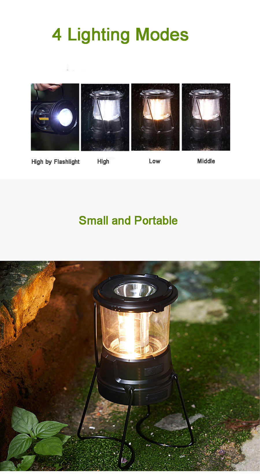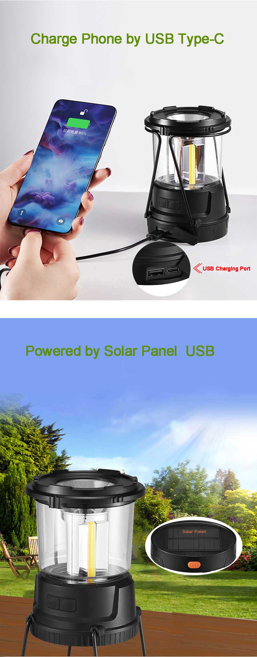 【Rechargeable & Power Bank】With the built-in rechargeable battery,the solar camping light can also serve as a power bank for smartphone or mobile devices in an emergency.