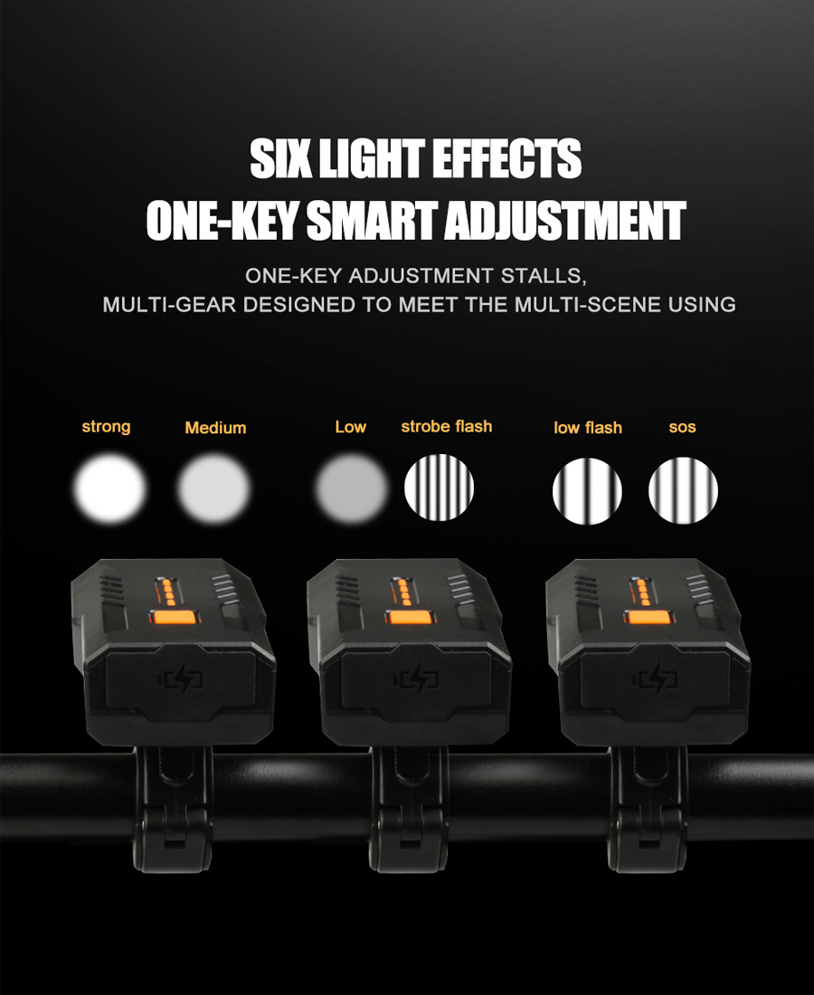 【6 Lighting Modes】The bike headlight has 6 lighting modes,strong,medium,low,strobe flash,low flash and SOS and it's simly to shift between them by clicking only one button.