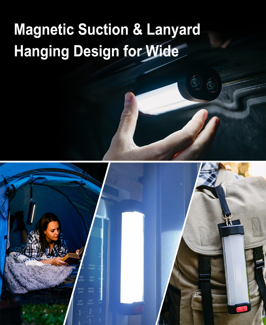 【Magnetic&Lanyard Design】With a built-in magnet,solar camping lamp can be attached to any metal surfaces such as car bodies to provide lighting.It also can be hanged on backpack by lanyard.